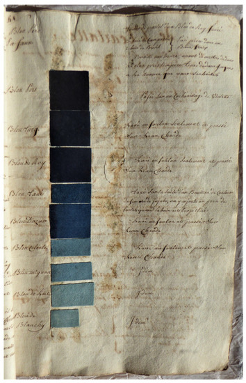 Antoine Janot’s scale of blues from the woad and indigo vat. Memoir on dyeing, 1744. Archives départementales de l’Hérault, ref. C/5569, folio 2 recto (credit: D. Cardon/P.-N. Granier).