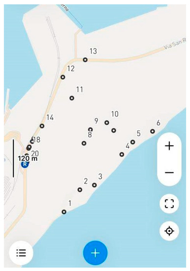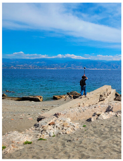 The on-site survey was carried out in two phases using digital photogrammetry and laser scanning. The project was georeferenced with ground control points (GCPs) measured with an Emlid Reach RS2 receiver connected to Sicili@net, a positioning network by Sezione di Catania Osservatorio Etneo INGV (Figure 6 and Figure 7).
