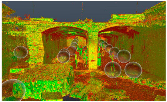 Scans were acquired and registered using targetless methods (ICP), whereas ground control points were used to georeference the consolidated point cloud (Figure 8). Scans were registered among themselves with an overall error of about 0.7 cm, then control points were added to the project, resulting in an overall georeferencing error of ±2–3 cm. The photogrammetric project around the cistern had a higher level of detail, and some control points were also added from the registered laser scans. The overall RMSE for this project was about ±1.5–2 cm.