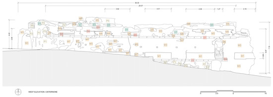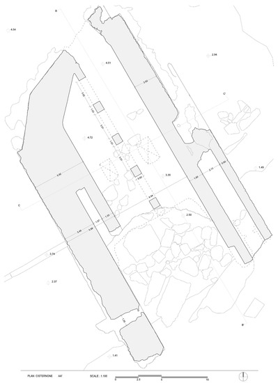 The documentation of the remains of the cistern contributes to the understanding of its building techniques and evolution throughout time. As the historical background of the cistern is unknown, hypotheses concerning its past result from its documentation. In addition, the documents form a reference point to which further monitoring or documentation campaigns can be compared. From the information on the point clouds, plans, sections, and elevations were created for the cistern. These drawings, made with the software AutoCAD, give a greater insight into the dimensions and structures of the building (Figure 9).