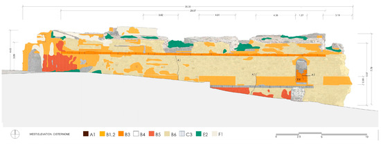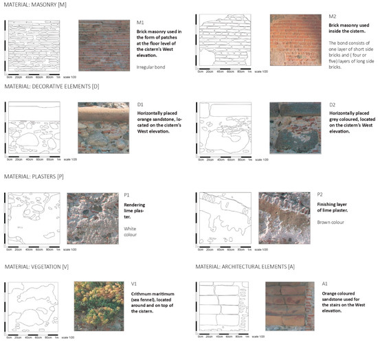 The material study distinguished several categories, from which the first category includes the different types of masonry (Figure 10 and Figure 11). The different bonds and materials used for the masonry help us understand the building techniques and evolution. Furthermore, the identified types of masonry can be cross-referenced with the masonry of other remains on-site to examine similarities.