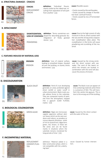 The damage analysis was carried out in a similar way, namely by categorizing different changes in condition. The approach to classifying these changes was executed in line with the 2008 ICOMOS damage atlas [15], as well as the consequent European Technical standards on the Conservation of cultural property and cultural heritage, which include important updates [16,17] (Figure 12 and Figure 13).
