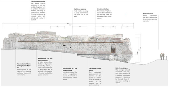 One part of the proposal deals with suggestions for conserving the surveyed cistern (Figure 14). A physical barrier between the cistern and the sea in the form of a dyke is suggested as most harm is inflicted on the building through direct contact with the sea. Furthermore, a layer of sheer whitewash is suggested to protect the remains from the strong winds, which contain a high concentration of salt particles. The consistency is to be determined after the evaluation of the remaining layers of plaster. The decorative elements made from sandstone are not suggested to be covered with whitewash as they return to other parts of the fortification. Furthermore, crack monitors can be installed during the stability investigation, and possible structural interventions can occur. In general, only the necessary restoration interventions are suggested.