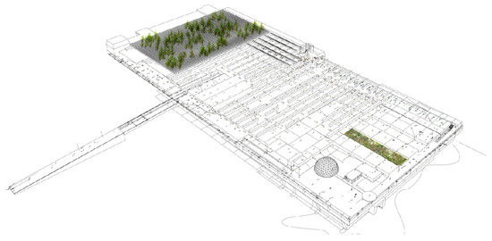 The garden of ‘the third landscape,’ located on the roof of the building, consists of three typologies. ‘The first one is the forest of Aspen trees, which counts about 107 trees. They are placed on the roof and pop out between elevated concrete beams. The second designed area is the garden of the family of ‘Sedum’ plants. Here, different roof chambers are covered with plants that can survive on the concrete soil, with for example, ‘Sedum’. An opening is created through the compartments, which function both as a perspective view and as a water channel (Figure 16). The last garden, ‘the label garden’, allows new species of the plant kingdom to arrive by the strong winds. Those species are, after their arrival, identified and labeled (Figure 17)’ [13].