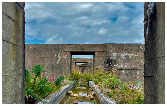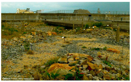 Photograph taken on the roof of the submarine base. Showing the ‘label’ garden. (Couy-Perrais. P., from the website: www.coloco.org, accessed on 20 September 2023).