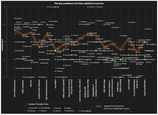 Problems reported by experts were subject to a detailed analysis in individual cities. The results are presented in Figure 2. Thanks to this comparison, it can be seen that the experts were not unanimous, and the cities can be grouped according to similar problems. Most of the examined cities show a level close to the average (marked with a dotted line), but in the case of a few problems, some cities record extreme results. Among them is Venice, which particularly strongly emphasizes the problem of depopulation and short-term rental. Dun Laoghaire, on the other hand, points to high land prices. Some cities also show a lower level of reported problems than others. An example is the aforementioned Dun Laoghaire, which does not record problems with traffic jams, air pollution, excess alcohol outlets, night noise, or safety problems.