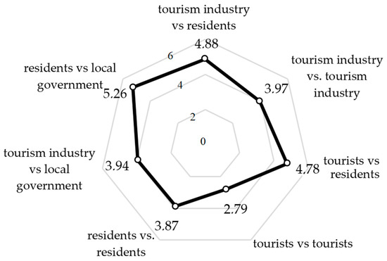 The distribution of the responses indicates how difficult and subjective it is to assess the sources and the social groups that may be in conflict. The experts were also asked to determine to what extent tourism caused conflicts between groups of city stakeholders before the pandemic. This time, however, the experts were given the opportunity to determine the intensity of these conflicts on a scale of 1 to 10 (where: 1—weak conflict, 10—extreme conflict). Figure 3 presents an overview of average scores for each of the conflict pairs identified in the studied tourist destinations. It should be noted that the most frequently identified conflict is the relationship between residents and local authorities (5.26), although the tension in this conflict should be described as average. Slightly lower average scores are noted for the relationship between tourists and residents (4.78) and between tourism enterprises and residents (4.88). Conflicts of the lowest intensity occur among tourists themselves (2.79).
