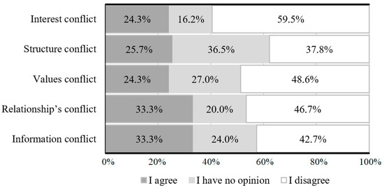 It is important to identify the sources of the conflict between the stakeholders (Figure 4). The analytical tool for managing the universal nature of conflict is the so-called wheel of conflict [58]. The research shows that most of them, i.e., every third (33.3%), indicate two equal causes. The first is a conflict of relations (transferred from the sphere of interests), i.e., an attitude in which the stakeholders have a negative emotional attitude towards the other party related e.g., to stereotypical images or misunderstandings, where each party is obliged to retaliate and communicate in this form. The second source is an information (data) conflict, in which the stakeholders are not able to determine the actual state (they have incorrect data or interpret it differently, or rely on false information, e.g., gossip). Other sources of conflicts were indicated by a smaller percentage of experts but in each case a high proportion, totalling 25% of respondents. A total of 25.7% indicated a conflict of structure as the source of conflicts, i.e., a conflict that is not caused by the individuals in conflict, but by the structure in which they function. This may be the structure of the company, a specific social situation, the dominant model of culture, or the environment. This is a conflict that is better than the others. Until it is resolved on a structural level, the dispute will return like a boomerang.