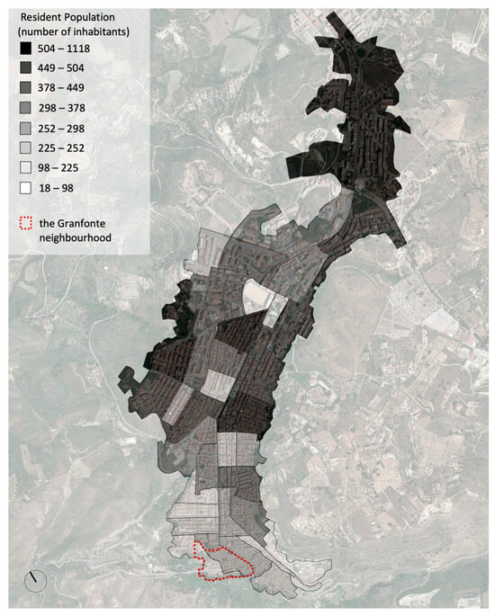 Resident population in the urban area of Leonforte by census section. Elaboration based on data from the 15th Census of Population and Housing, 2011 [59]. Google Earth Image Overlay (our elaboration).