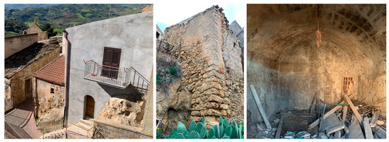 The Granfonte neighbourhood is located on a steeply sloping terrain on the southern flank of Mount Cernigliere. Its settlement condition is a peculiar expression of a rupestrian building culture typical of the central-northern area of the metropolitan area of Enna [60]. Therefore, the coexistence of rock and the built environment is a constant, and the analysis of this relationship is the key to understanding the way in which they are combined. The presence of rocky outcrops and natural constraints conditions the overall layout, i.e., the construction solutions and distribution of houses, which tend to exploit the natural slope to optimise the limited space available [61,62].