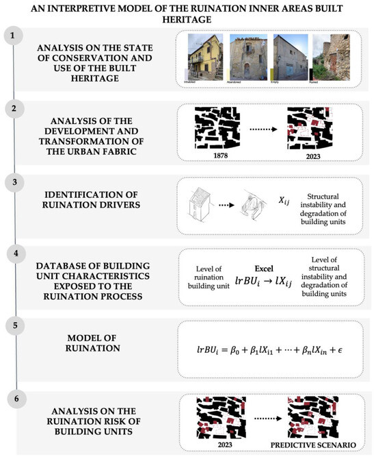 Following this phase, the methodological approach aimed at defining an interpretative model of the ruination of the built heritage of the internal areas, which was chosen and tested on the Granfonte neighbourhood in Leonforte, is divided into the following phases (Figure 4):