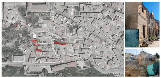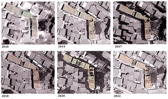 At the urban scale, the analysis of the development of the built fabric is useful for detecting the progress of the ruination process over time to understand current problems. This phase of the study makes use of information from additional sources, such as historical photographs available on the Regional Spatial Information System on Google Earth in the years 2000, 2006, 2010, 2013, 2016, 2017, and 2022 [75] and photographs taken by drone [76,77].
