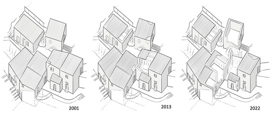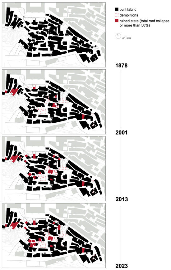 The built fabric from 1878 to the current situation shows the progress of ruination and, contextually, demolitions. Redrawn on the basis of the current cadastral map. The maps summarise the comparison of historical photographs areas available on the Regional Territorial Information System (RTIS) and on Google Earth, dated 2000, 2006, 2010, 2013, 2016, 2017, and 2022 (our elaboration).