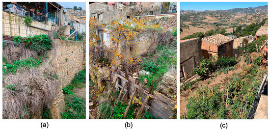 In addition to demolition, there is an alternative way of securing the ruins. Following their partial demolition, the buildings have been filled with rubble and waste; they have then been used as supports for terraces and belvederes or as car parks or have been transformed into private vegetable gardens. In this sense, the intervention carried out between vico Vitale and via Risicato is emblematic (Figure 8). The volumes of the houses on the slope, now devoid of roofs, were filled with soil and rubble, following the precarious securing of the facade walls downstream. This intervention is a symptom of an inappropriate way of dealing with the problem of ruins. In fact, in addition to definitively erasing the traces of pre-existing buildings, it is an inadequately designed consolidation operation that does not even ensure a safe response to the new function of being a retaining wall.