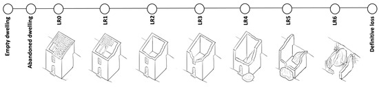 The identification of the ruination drivers of a building unit was the basis for constructing an Excel database, in which each ruination level () of the building unit is associated with a level of the building characteristic (). The score representing the ruination level of the building unit will be defined based on some indicators related to the state of preservation of the building elements, which is considered as a proxy for the ruination level of the building units. The items related to the types of degradation and structural instability—partly taken from the sheets of the Risk Map for Historic Centres [80]—may be declined according to classes of predefined types and expressed according to an ordinal scale of increasing severity.