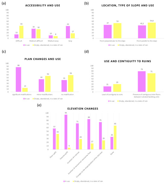 The close reading of the urban fabric has made it possible to assess the actual repercussions of the marginalisation phenomenon on the historic built-up area. The analysis of the building use reveals a diversified scenario corresponding to the evident fragmentation of residence: there are buildings in good condition and still inhabited—but often heavily transformed—alternated by empty, abandoned, and even ruined buildings. This investigation, shown in Figure 5, thus clearly highlights the partially abandoned condition of the neighbourhood; in fact, abandoned dwellings account for about half of the total. The critical reading of the building fabric has also made it possible to identify the presence of some building units that should already be considered as in a state of ruin according to the classification adopted here, as they have roof collapses of more than 50%. Some of these appear to be affected by processes of a more advanced ruination as they are involved in serious structural instability. On the other hand, a few building units had a provisional roof following the collapse of the original one.