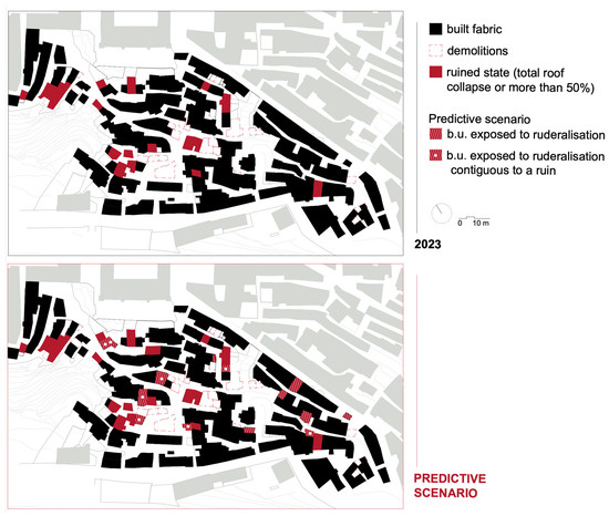 The starting point for the analysis of the ruination process is the cadastral map of 1878. The critical restitution of this map on the basis of the current cadastre led to the recognition of the built areas that have retained an unaltered conformation until today. It is reasonable to assume that at this date, the neighbourhood was very dynamic and free of derelict areas and ruins. The 2001 census already showed that, similarly to what was found for abandonment, ruins also tend to be concentrated in certain areas, forming clusters. In particular, the upper part of the neighbourhood shows a conspicuous presence of ruined buildings that are concentrated particularly at the end of the blind street. Similarly, the aggregate at the bottom, also a dead-end street, approaches becoming a second cluster of ruins alternating with heavily structurally compromised buildings. The condition observed in 2013 clearly appears to have worsened. On the one hand, the number of ruined buildings increases in the vicinity of the two areas already affected by the phenomenon; on the other hand, the process of ruination advances, involving new areas. The snapshot to 2023 shows the extent to which the steady growth of ruined buildings is now a blight on the neighbourhood.