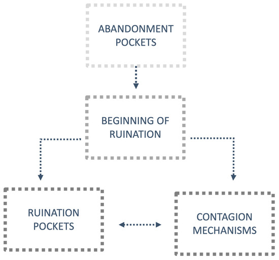 However, it has been noted that many centres, even those that are in good condition and well serviced, reveal areas that are unhealthy and disused [16]. Therefore, the complex nature of abandonment implies a possible co-presence of different levels of severity which, in situations of prolonged maintenance debt, can evolve to the point of ruination and, in extreme cases, the definitive loss of large areas.