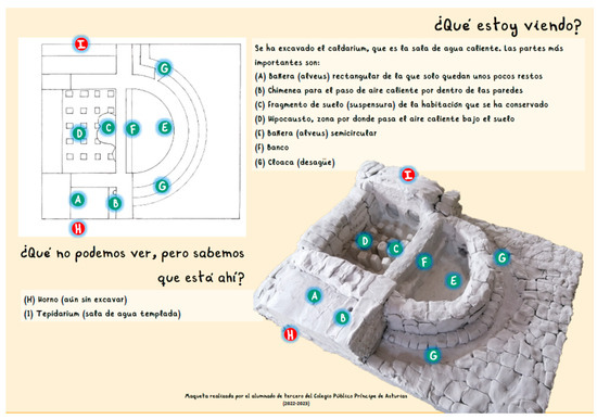 Thus, multiple visits were made to the thermal complex to carry out different tasks, such as the critical analysis of the panels, the observation of the different constructive elements, or the taking of measurements for the creation of a plan and a model, in which the 3rd year primary pupils take part (Figure 2). In addition, different materials are prepared that serve as visual support to use in the making of the new panels, such as the labels for the titles or subtitles, the making of images of the funerary stele or its discoverer, of the parts of the Roman Baths, the map of the borough, etc.