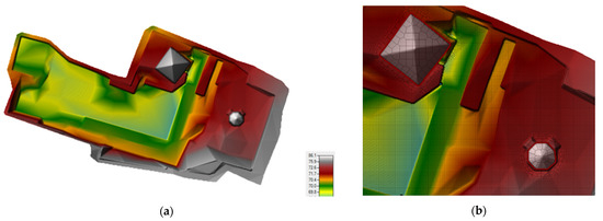 For this purpose, a very detailed digital terrain model (DTM) with a resolution of 0.2 m was produced for the wider area of the Roman Agora, in which, in addition to the ground elevations, the elevation surfaces of the most important buildings within the study area are depicted, that is the monument of interest (Tower of the Winds) and the Fethiye Mosque, as shown in Figure 2. The computational mesh was developed as a two-dimensional grid, which has an area equal to the watershed and a spatial resolution for most of the region equal to 0.5 m. For reasons of model stability in areas of steep slope changes due to above-ground constructions, a coarser grid resolution of approximately 2 m was chosen in the areas of the buildings (refinement regions tool; Figure 2). The simulation was carried out using a time step of 1 s in order to satisfy the Courant et al. [32] condition for the given cell size (0.5–2 m), while the duration of the simulation was chosen in order for the maximum flow depth to occur.