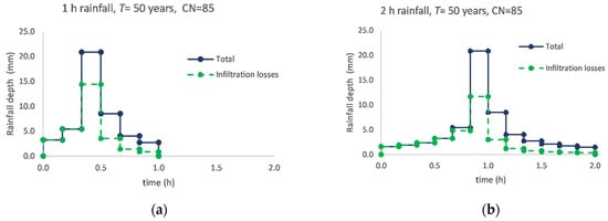 Total design rainfall hyetograph based on the AB method for durations of 1 h (a) and 2 h (b), a 50-year return period, and corresponding infiltration losses (mm) of CN = 85.