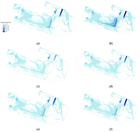 Upper row: maximum flood depths for D = 1 h, CN = 85, and T = 100 years (a) or T = 1000 years (b). Medium row: maximum flood depths for T = 50 years, D = 1 h, and CN = 75 (c) or CN = 85 (d). Lower row: maximum flood depths for T = 500 years, CN = 75, and D = 1 h (e) or D = 2 h (f).