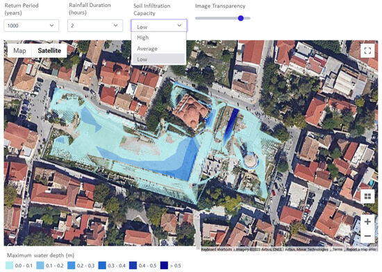 Results suggest that the flood hazard is not significant in the region of direct proximity to the monument (Tower of the Winds), but other flood-prone areas in the Agora (such as the lower terrain region where the Peristyle is located) have been identified. In this case, the flood risk is mainly related to issues regarding the accessibility of visitors to the archaeological site after a major storm event and the requirement to clean the site and its exhibits due to stagnant water. Visualization of these results is made possible through the ARCHYTAS platform which allows the user to design a synthetic scenario based on the selection of a specific event duration, return period, and soil infiltration capacity (e.g., based on the user’s assessment of the antecedent soil moisture content, i.e., wet, average, or dry conditions) and assess the resulting flood map. This is made possible using a database of readily available scenarios and corresponding flood maps, thus minimizing the computational burden which is otherwise critical in this type of hydraulic model [34,35]. An update of the system may also allow the development of an early flood warning system for actual rainfall events, by coupling the platform with a local rain gauge and retrieving flood maps based on similarity criteria.
