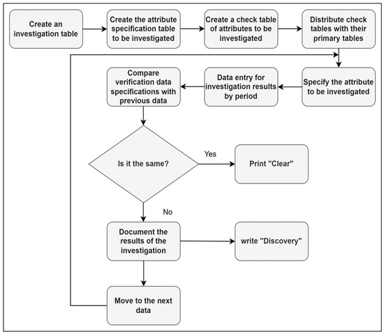 The DAQMP for the information system of preservation history and endowments is to create a recurring query model from the original tabular data to the next specified data specification table containing important data [64]. The specifications of this table will be checked through a check table that was created according to the previous data specification, but using the new data input of the verification results, then performing a join query to see the data similarity [65]. If there are differences, then analysis and investigation must be carried out and documented, and the data must be stored in a new table as findings. The conclusion of the case must involve the expert rather than the data object since the original authority of the data remains with the experts in the data field [66]. Steps to perform DAQMP semi-automatically are shown in Figure 9.