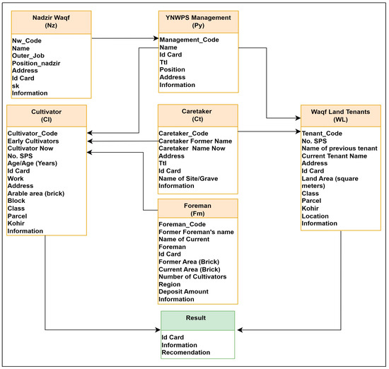In the graph, the data commodities that YNWPS controlled were shown as gray circles. These goods included land, rice fields, historical buildings, sites, tombs, manuscripts, and data about people involved in managing and using waqf assets. Existing data cataloging products have recently begun integrating ML to recommend actions based on prior user interaction and column matching learned from previous labels. To facilitate data analysis, a model representation was developed [48]. Based on the representation of datasets from Figure 2, 13 entities are taken to study their relationships, as shown in Table 1.