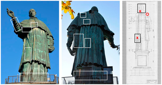 Colossus of San Carlo of Arona, named San Carlone. The white frames indicate the studied areas, while the red marks indicate the location of temperature and relative humidity sensors.