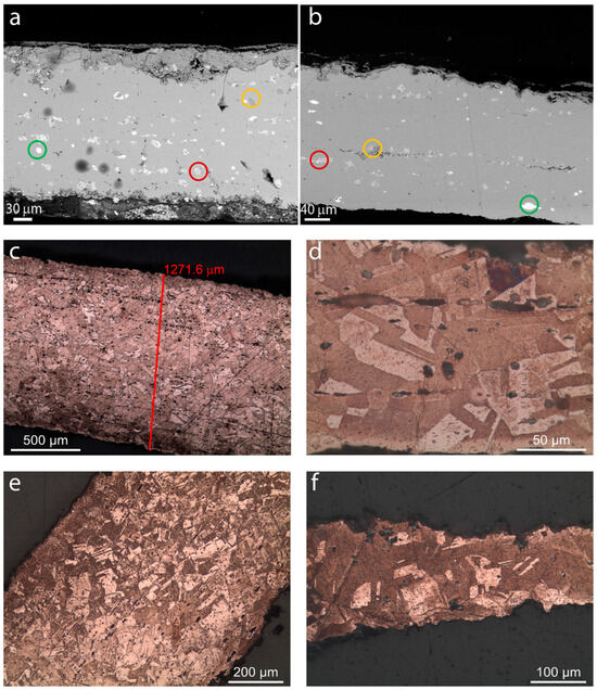 SEM images (a,b) of cross-section of copper samples from the San Carlone. EDX analysis revealed the composition of inclusions in the copper matrix: Cu oxide (yellow circles), Pb/Sb oxide (green circles), and Sn oxide (red circles). Optical microscopy images of cross-section of copper samples (c–f) are also included, where oriented inclusions (c,d), non-oriented inclusions (equiaxed), and round-shaped grains can be observed (e,f).