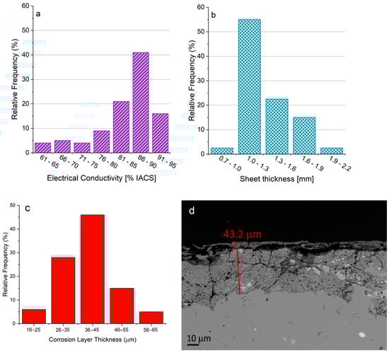 On-site measurements of (a) electrical conductivity; (b) thickness on the copper sheets of the San Carlone; and (c) thickness of corrosion layers by means of eddy currents and (d) SEM observations.