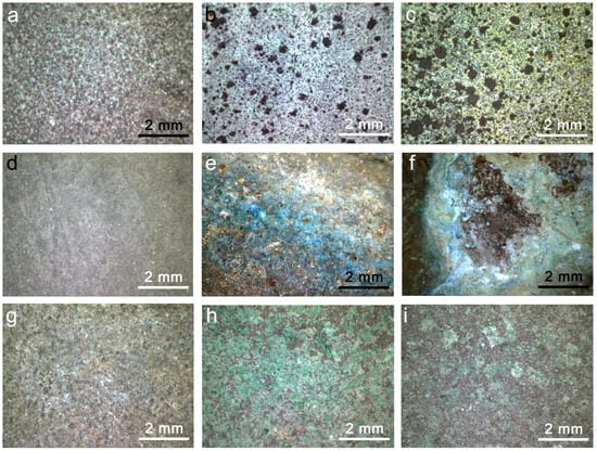 Portable microscopy images of surfaces of the colossus of San Carlo of Arona. (a–d): images acquired on unsheltered surfaces; (e,f): images acquired on peculiar corrosion products found only in limited and small areas; and (g–i): images acquired on sheltered areas.