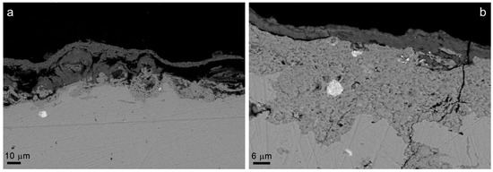 The on-site microscopic observation of the surfaces highlighted an evident variability in the aspects of the corrosion layers (Figure 4). Black and green patinas are predominant, as expected for corrosion layers formed in outdoor environments [7,9]. Compact and adherent patinas have also been observed on unsheltered surfaces (Figure 4a–d), with no significant differences related to the surface’s cardinal orientation or height. These patinas showed a typical two-layered structure, widely documented in the literature for copper natural patinas [2,4,16]. EDX analysis confirmed that the internal layer (Figure 5), normally referred to as primary patina, is mainly constituted by copper oxides, in agreement with the literature. The outer layer (Figure 5), also known as the secondary patina, is rich in sulphur, suggesting the presence of sulphate-based compounds on the surface of the samples. Additionally, the oxide-based inclusions, observed in bulk copper, are still visible in the corrosion layers (Figure 5b). These inclusions were probably incorporated as the corrosion proceeded [17].