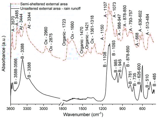 Antlerite was the main corrosion product detected by FTIR on sheltered and semi-sheltered surfaces. Its characteristic peaks are visible in the fingerprint region of the spectrum and at 3570 and 3485 cm−1 [18]. Moreover, a wider variety of corrosion products with respect to the unsheltered areas can be clearly identified. In the spectrum reported as an example in Figure 6, the distinctive signals of copper oxalate (2960, 2875, 1660, 1361, and 1318 cm−1) and the main peaks of atacamite (3444 and 3344 cm−1) [18] can be identified.