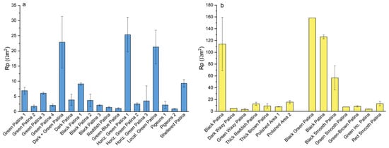 Rp values significantly lower than 5 Ω∙m2 have been measured in some specific cases. These low values, even lower than 1 Ω∙m2, correspond to the presence of relevant amounts of dejections of birds. It is known that these are corrosive substances; therefore, their effect on the corrosion behavior must be considered as wide external areas of the statue are affected by their presence. Other Rp values lower than 5 Ω∙m2 have also been measured in correspondence with peculiar corrosion products, observed only in a few localized areas (Figure 4e). These Rp values were obtained on some areas whose patina appeared to be uniform and stable (Figure 8a; values labelled as “green patina 2” and “4”, “green-blue patina”, and “reddish patina”). Such differences do not appear to be correlated to a different composition of the corrosion layers. It can be supposed then that such low protectiveness of these patinas may be related to morphological characteristics like adhesion and porosity.
