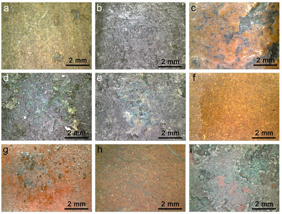 The composition of the patina on bronze and brass materials is often composed of copper salts and minerals as corrosion products. Their composition mainly depends on the specific exposure environment. However, peculiar corrosion products have been detected due to the presence of alloying elements. Patinas formed through long-term exposure to the environment exhibit a heterogeneous aspect, influenced by surface morphology, roughness, inclination, and exposure conditions [3,4,7]. Initially, a thin, compact, and reddish–brown layer mainly constituted by oxides is formed [7,8,9]. Upon further exposure, the surface layer darkens to a brown–black color that may still be constituted only of oxides [7,9]. However, the darkening might also be related to the interaction with other pollutants [8,10]. Finally, a greenish patina appears after several years of exposure, when the formation of basic copper sulphates or chlorides occurs [7,9].