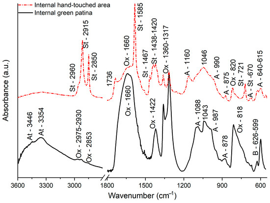 On the hand-touched areas (Figure 10), instead, a peculiar composition has been detected: besides antlerite and copper oxalate, the signals of copper stearate were clearly identified. This is probably the product of the reaction between copper ions and stearic acid, one of the most abundant fatty acids normally present on the human skin. Moreover, a higher presence of lead compounds (anglesite) with respect to the external surfaces is suggested by FTIR and XRD analysis. The presence of lead-based compounds is more relevant in correspondence to area S, characterized by thick powdery patinas, apparently heavily affected by deposition phenomena. Their presence may then have a pollution/deposition-related origin.