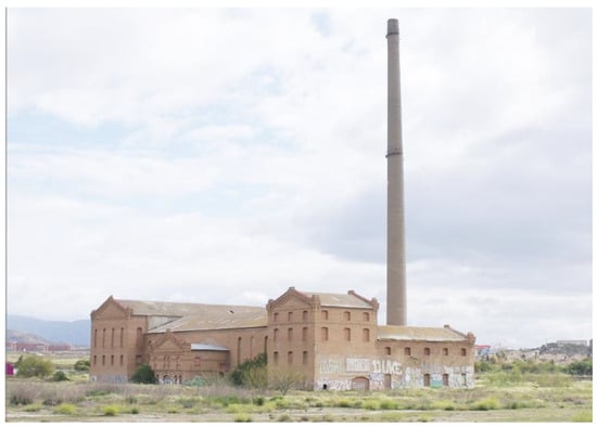 El Tarajal sugar mill, a joint-stock company with representatives from Malaga’s high society familiar with politics and business, is a significant example of steam sugar production in Malaga. The company was established in 1930 and began operating in 1931, when the factory’s construction was completed on land near the Guadalhorce River, and authorization for production was obtained. Despite ambitions to be the first of a series of factories in the province, and while it was initially planned to process sugar cane and beets to avoid the seasonality of traditional cultivation, it operated for only a few years before being dismantled in 1939. Subsequently, from 1945, it was used as a cork stopper factory until the 1960s, after which the building began a process of abandonment and progressive deterioration [23]. Designed by architect Manuel Rivera Vera (1879–1940), the factory is a prominent example of the Malaga industry in the first half of the 20th century. It features exposed brick, lowered arches, pediments on the entrance pavilions, and ornamental finishes on the corners. The load-bearing masonry structure and metal trusses supporting lightweight roofs allowed for spacious, open-plan, and high-ceiling spaces. The building has Grade II architectural protection in the current Malaga planning, with the chimney subject to the highest protection. The industrial installation included various auxiliary buildings, from housing for workers and engineers in charge of the factory to warehouses, all of which have been demolished. Only the main irregularly shaped H-building, the chimney, and an interesting water tank remain (Figure 1). Due to the abandonment of industrial activity, the level of deterioration is high, and all traces of machinery have also disappeared [23].
