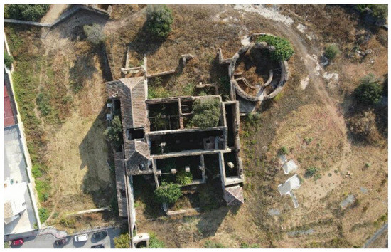 The building is composed of a series of compact pavilions that create an irregular shape (Figure 2). The volumes are defined by their function in the production process and the needs that arose over time, making it difficult to establish a chronological order for the entire complex. The irregular topography of the plot is utilized in the configuration of the building, which extends up to three levels in the south orientation. Built with load-bearing brick, wooden trusses, and Arab-style tile roofs, the most interesting elements, although challenging to date, are the south entrance portico and the portico on the north facade. The first features two pointed arches preceded by a wide staircase, and the second has two semicircular arches and a lowered central arch, a rhythm that is repeated on the first floor, with the central opening replaced by a window, the dating of which is uncertain. A circular structure near the east facade was used for peeling and chopping the sugarcane before grinding. The ruins of the pavilion suggest a two-level structure, which is unique for the time period. The main source of energy came from the aqueduct that passes by the west facade, for which privileges of use have been documented since 1644.