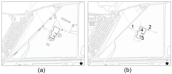 Identification of the different phases of the El Tarajal industrial complex. (a) Light grey: demolitions between 2007 and 2016; light blue: new bridge over the railways 1990. (b) Present state: 1. control gate; 2. water tower; 3. chimney; 4. main building. Source: Federica Dragani, 2020.