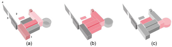 Identification of design strategies, the Trapiche del Prado. (a) Circulation flows: 1. south entrance; 2. north entrance; 3. northwest public access; 4. aqueduct. (b) Activities: dark grey. management and leisure; pink. sport; light grey. wellness. (c) Design strategies: light grey. restoration of existing volumes; pink. reconstruction of damaged volumes. Source: Vincenzo Stapane, 2022.