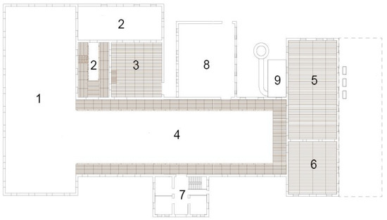 The project for the Tarajal Sugar Mill proposes a range of complementary uses, including a space dedicated to the presentation and interpretation of industrial machines, even though the building has been stripped of all industrial remnants. Once the product routes, from the storage of raw materials to the distribution of the finished product and the processes that made it possible, have been reconstructed (Figure 5), the idea is to recover the logic used during the cork production era. The main hall, which was once an area for processing, will serve as a museum space with a lineup of machinery that recalls the original production line. This machinery will also be observed from the reconstructed perimeter gallery. Similarly, the charcoal kiln, which allowed energy generation via the nearby boiler, will be transformed into an “air factory”, a botanical filtration system for indoor air purification [28]. The system, previously tested at the Florence Tobacco Factory, not only reduces the building’s energy demand, but it also architecturally and philologically reinterprets the coal storage space as a source of energy for the building’s operation.
