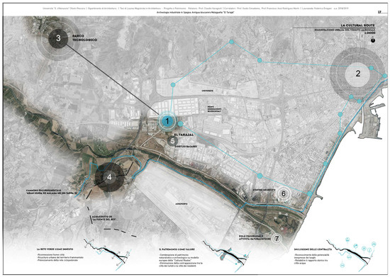 Centralities and new connections of the Tarajal factory. 1. Tarajal factory; 2. downtown Malaga; 3. Andalusian Technological Park (PTA); 4. naturalistic walkway; 5. Bacardi factory; 6. local sports facilities; 7. naturalistic activities. Source: Federica Dragani, 2020.
