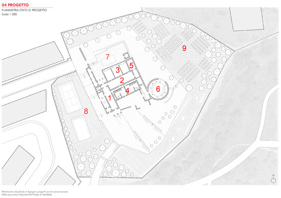 The urban pressure in the coastal municipality of Marbella has gradually occupied the hillsides with residential buildings, ultimately surrounding the Trapiche factory. Only the spacious 12,000 sq.m. plot on which the factory is located has allowed the preservation of the building (despite the decay due to disuse and lack of maintenance) and also enables its interpretation in relation to the surroundings. The current colonization policies are based on constructing the maximum number of residential units allowed by the existing urban planning, minimizing infrastructure and services. This project has a different approach than the previous proposal, as it focuses on services for the neighborhood, offering different levels of use. While private management is considered for the sports facilities inside the building, there are also public sports and recreational facilities planned for the rest of the plot. Tennis, football, and basketball courts open to the neighbors aim to activate this site during extended hours, revitalizing the area. The planned green spaces also offer meeting places for the residents, providing an important tool for urban regeneration (Figure 7).