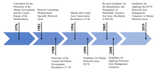 MPAs (marine protected areas) were established to create an integrated marine-land system of protected environments. The adoption of the specific action of protecting the marine environment is even more necessary for the Mediterranean Sea due to the amount of relevant archaeological evidence that is disseminated. For this reason and “because of their scientific, aesthetic, historical, archaeological, cultural or educational interest”, in order to safeguard the resources, natural sites, and cultural heritage of the Mediterranean Sea, with the possibility of identifying MPAs for preserving relevant sites, the United Nations Environment Program (UNEP) Regional Seas Program proposed a regional convention [21] to prevent pollution from various human sources in the Mediterranean Sea. The convention was adopted in 1976, updated in 1982 [22], and amended in 1995.