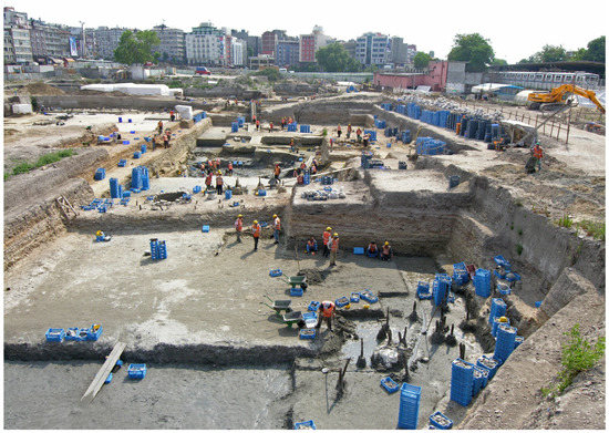 - Kızıltan, Z. Excavations at Yenikapı, Sirkeci and Üsküdar within Marmaray and Metro Projects. In Istanbul Archaeological Museums, Proceedings of the 1st Symposium on Marmaray-Metro Salvage Excavations, İstanbul, Türkiye, 5–6 May 2008; Kocabaş, U., Ed.; Epsilon: İstanbul, Türkiye, 2010; pp. 1–16, ISBN 978-605-60853-6-9. [Google Scholar]
