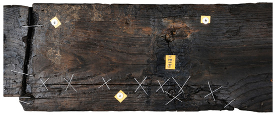 Epoxy sheets are used in highly deteriorated, thinned, and non-self-supporting wooden elements (Figure 7). In this method developed by Prof. Ufuk Kocabaş, a thin layer of aluminum foil was placed on the timbers to prevent the epoxy from smearing on the surface of the timbers was coated first [22] (pp. 86–88). Furthermore, a rapid-setting hardener, Araldite®® FC 52, was prepared, applied to the aluminum foil, and supported by fiber textile. Following a polymerization period of 8 to 10 min, a thin framework of wood laths was placed into the epoxy mold, which took the shape of the timber. This mold was then seated on the ceiling plank, and the carrier construction and the ceiling plank were tied with skinny synthetic textile belts. Finally, the ceiling planks were lifted by preserving their forms entirely by using this method. Despite the high cost and the need for specialized personnel to work, this method has been determined to provide excellent protection for the removal of sensitive wood.