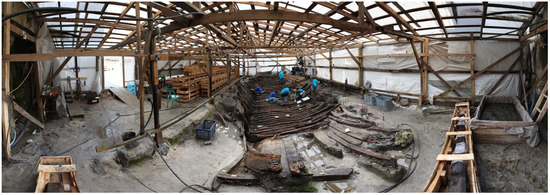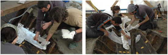 The methods used in the removal of shipwrecks, the conservation process, and the exhibition approach are closely related to each other. The lifting techniques from the excavation area vary according to the excavation conditions and possibilities and the preservation status of the ship’s timbers. The removal of large shipwrecks is carried out according to the decisions taken for the excavation, laboratory, and storage facilities. As with the Vasa and Mary Rose ships, very large and highly preserved shipwrecks can be removed as a single mass [39,44]. In contrast, smaller shipwreck hulls can be lifted by cutting them into pieces, as with the Dover and Arles-Rhȏne 3 boats [45,46]. Dismantling is a preferred method for detailed in situ documentation as well as excavation conditions and possibilities. Many shipwrecks, including Kyrenia, Serçe Limanı, Yenikapı, and Skuldelev shipwrecks, in scattered or intact conditions from underwater and wetlands, have been removed by dismantling [26,47,48,49].
