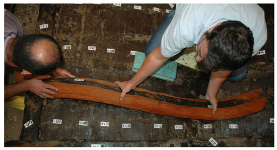 In this method, the planks were lifted with supports placed on the outer surface of the hull [22] (pp. 82–85) (Figure 12). L-shaped carriers were prepared as described in the lifting of the ceiling planks. Since the hull planks were in direct contact with the ground and were larger in size, the application was developed accordingly. The sand and sediment underneath the plank to be lifted were moved away with water, and the L-shaped carriers were placed periodically on the outer surface of the plank. The carriers aligned up and down according to the curve of the plank and were fastened to a wooden beam. Finally, each hull plank was lifted, retaining its integrity and original curvature, and placed into custom-made crates. Wales and mast-step timbers were also lifted using the same method.